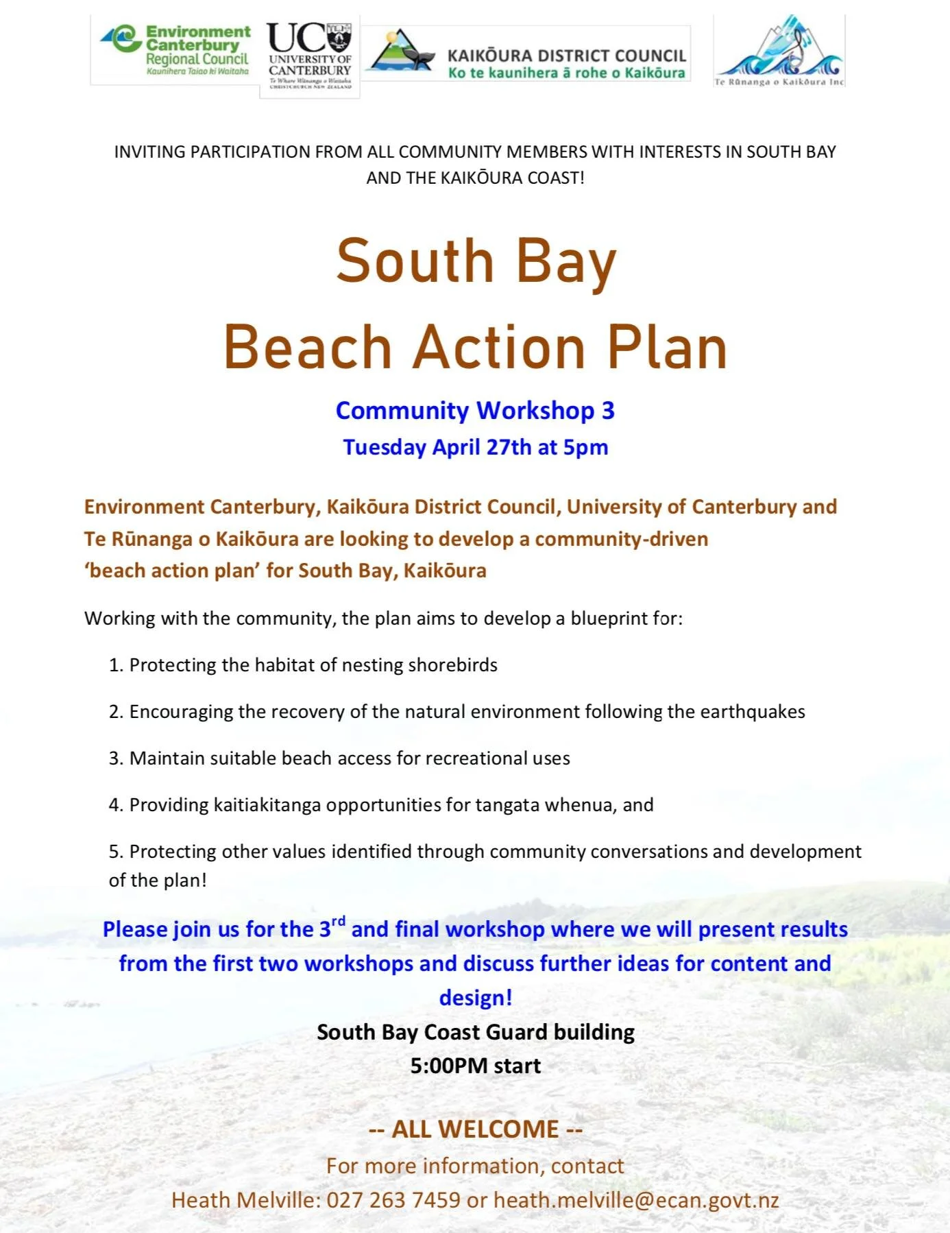 ECan will be holding its first workshop for the South Bay Beach Action Plan, from 5-7pm on 4 March 2021 at the South Bay Coastguard. While this hui intends to attract the wider community who are passionate about South Bay and its wildlife, the workshop is open to everyone.